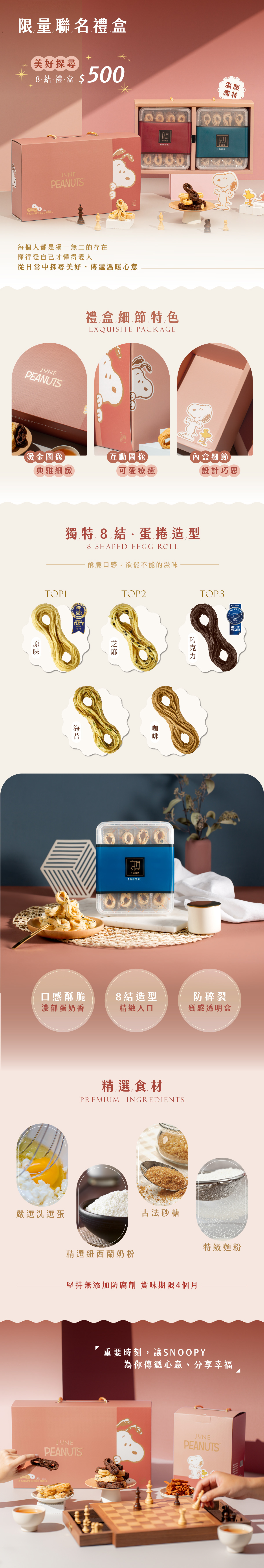 海苔蛋捲成分:雞蛋、麵粉、植物油(大豆油、芥花油、棕櫚油)、砂糖、奶粉、食鹽、海苔粉、蛋黃粉、香草粉[香料、乳糖、葡萄糖、玉米粉(非基因改造)、品質改良劑(含二氧化矽、葡萄糖、阿拉伯膠、麥芽糊精)]