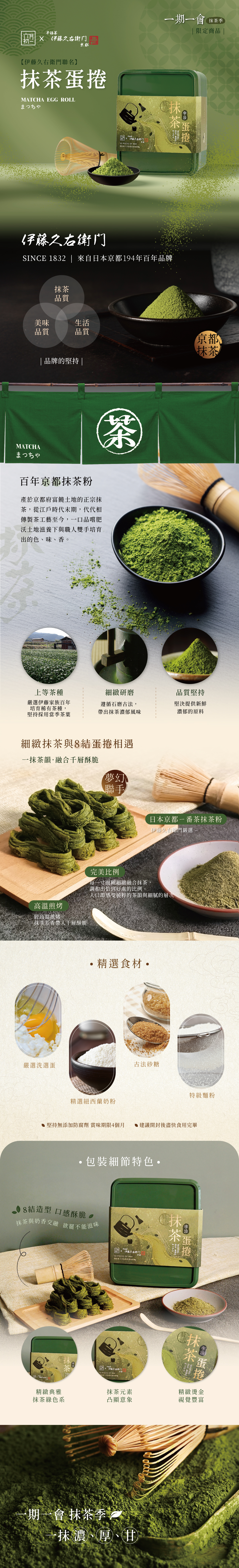 京都宇治抹茶蛋捲成分:雞蛋、植物油(棕櫚油、大豆油、芥花 油)、砂糖、麵粉、奶粉、抹茶粉、食鹽、蛋黃粉、香草粉(香料、乳糖、葡萄糖、玉米粉(非基因改造)、品質改良劑(含二氧化矽、葡萄糖、阿拉伯膠、麥芽糊精)、麥芽糊精、梔子黃、梔子綠