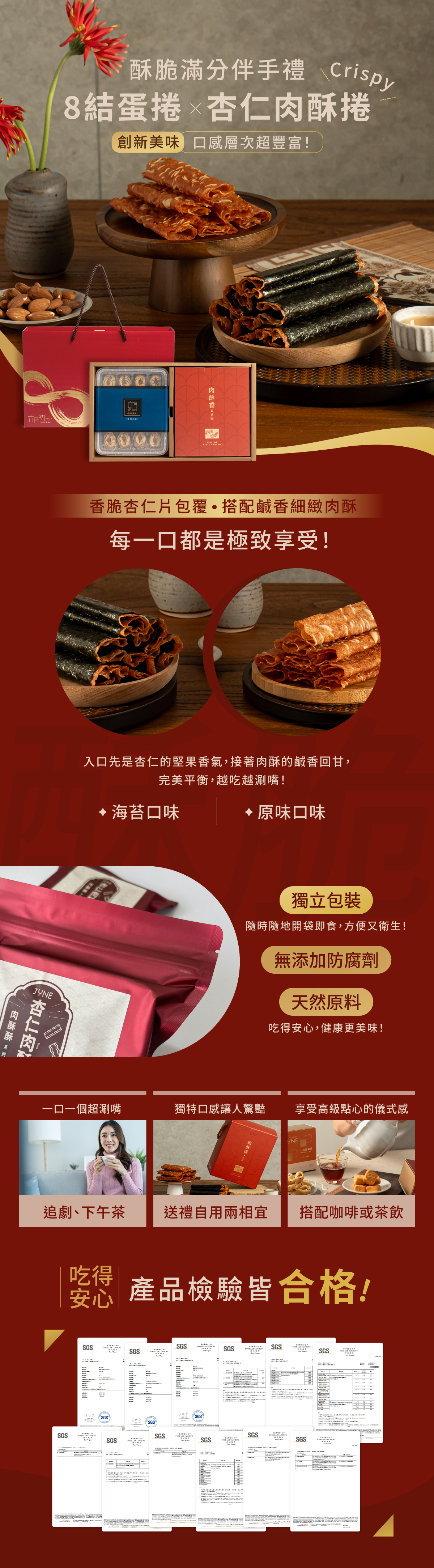 淨重:102 ± 8克,提盒內含兩袋海苔杏仁肉酥捲